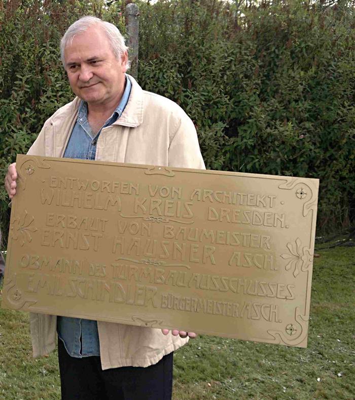 Poděkování za vrácení desky na její místo patří kromě sponzorské společnosti Heunisch také zejména panu Pavlu Matalovi (na snímku), který vytvoření kopie inicioval a sám se na její výrobě významně podílel.